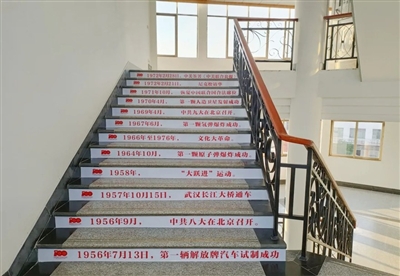通过精心设计规划,在委机关楼梯台阶立面,贴上了精美的党史知识条和党史标语,展示了中国共产党筚路蓝缕奠基立业的百年历程,不仅美化了办公环境,更方便了机关干部学习党史知识,营造出浓厚的学习氛围。