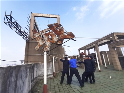 记者在温泉潜山商业街上的民联中医门诊门口看到,楼顶的广告牌长11米、宽4米。由于字体巨大,又设置在超高层楼顶,高空风阻增大,增加了作业难度,施工人员在做好安全措施后,采取手工氧割的方式在高空把整字切割成小块后,吊装至楼顶平地处,最后从电梯运下去。