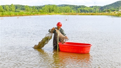 6月15日,嘉鱼县陆溪镇铜山村龙虾养殖基地,村民正在起龙虾,身后石壁山生态果园,1000亩脐橙果挂满枝头。