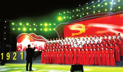 夜幕下的人民广场灯光璀璨,处处洋溢着喜庆热烈的节日气氛。晚7时30分许,孟祥伟、王远鹤、张士军、曾国平,市委常委,市人大常委会、市政府、市政协领导班子成员等走上主席台,领唱《没有共产党就没有新中国》。全场起立,齐声高唱。歌声铿锵激昂,饱含深情,唱出了全市干部群众对党的无限热爱和感激之情。