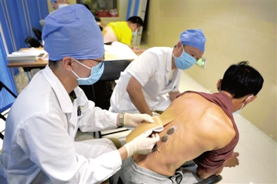 7月11日,在北京中国中医科学院广安门医院,医生为患者贴三伏贴。