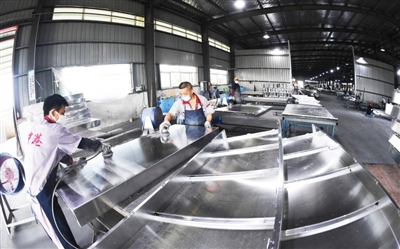 7月13日,湖北中港金属制造有限公司员工在生产线上忙碌。该公司位于咸安凤凰工业园,主要生产铝单板、仿木纹铝板、铝制天花、方通吊顶等金属材料。