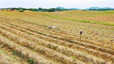 7月16日,嘉鱼县高铁岭镇九龙村湖北蓝之美农业科技开发有限公司的400亩蓝莓基地,村民冒高温为新栽种蓝莓苗浇水。