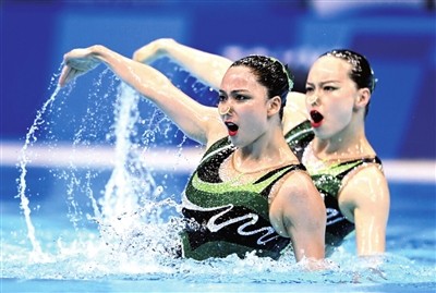 8月4日,中国选手黄雪辰/孙文雁在比赛中。 当日,东京奥运会花样游泳双人项目自由自选决赛举行。最终,中国选手黄雪辰/孙文雁获得双人项目亚军。据新华社