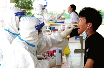 8月2日,在郑州市金水区的一个核酸检测点,医务人员在进行核酸检测取样。