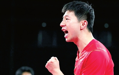 8月4日,中国队选手马龙庆祝得分。 当日,在东京奥运会乒乓球男子团体半决赛中,中国队战胜韩国队,晋级决赛。 据新华社