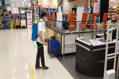 笔者在超市内看到,超市负责清洁的工作人员每隔一段时间就对超市入口、购物车、购物篮、公共厕所等一些公共区域进行消毒,生鲜区的工作人员也应要求全程佩戴手套操作,超市内部也加大了打扫的频次。