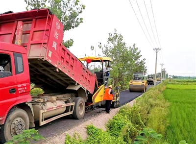 8月8日,在赤壁镇东柳村周朱线道路施工现场,工程运输车紧临摊铺机徐徐卸料,经过拌和摊铺处理、压路机初压复压,一条平整的沥青路面跃然眼前。