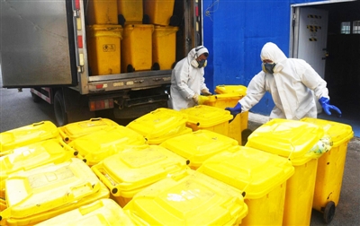 8月20日,湖北汇楚危险废物处置有限公司员工在市中心医院清运医疗废弃物。