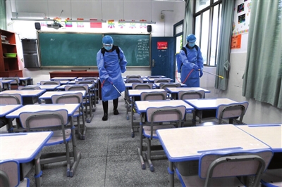 8月25日,在湖州市吴兴区龙泉街道龙泉小学,工作人员对教室进行开学前的防疫消杀。        据新华社