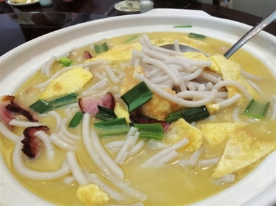 迫不及待地盛上一碗,先喝了一口汤,咸鲜中带着些许的辣味,十分开胃。腊肉极香,和通山的腊肉味道一样;蛋皮浸满汤汁,味道醇厚;折子粉不仅嚼着有筋道,而且还有折子粉独有的香味。