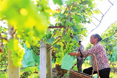 石咀村有着稀有的富硒黑土。2019年,该村将25亩低产地集中流转改种富硒葡萄。为进一步提高葡萄种植效益,今年,该村以每年6万元的价格将葡萄园委托给返乡创业青年廖利峰管理。目前,10000余斤红宝石品种已成熟,阳光玫瑰品种也即将上市。