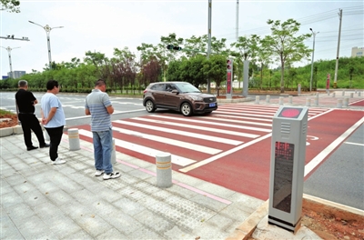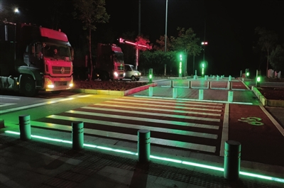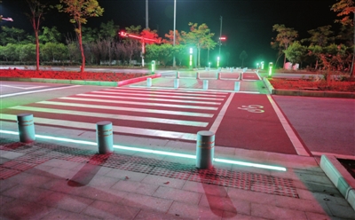 能说话,会发光的斑马线你见过吗?9月7日下午,记者来到市区东外环与三江路交叉路口处,远远就看到一条铺设了红色沥青的斑马线十分显眼。