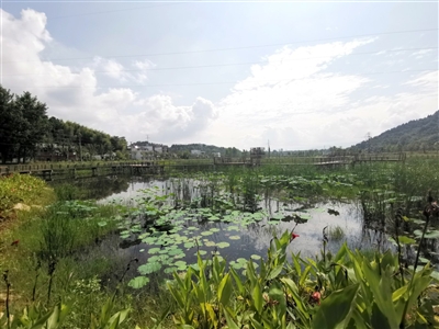 蓝天白云下,游客孟宇清打着油纸伞,步行进入了大坑村口的核电湿地公园。举目望去,荷叶、芦苇、菱叶生长茂盛,荷花、小桥、流水、古宅、石磨、石凳、石桌、凉亭点缀在湿地公园之中,融入历史印记,吸人眼球。