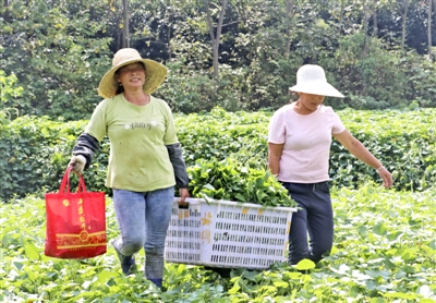 该基地种植苕叶尖20亩,从4月份开始,可持续采摘到10月份,高峰期一天可以采摘1500斤,现在一天可以采摘800斤左右。眼下,销往本地菜市场和各大超市的苕叶尖批发价为2元每公斤,一亩地纯收入保守预计可达2万元。