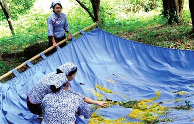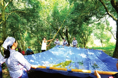 10月12日,阳光穿过密林光彩照人,古桂枝头花香四溢。位于咸安区桂花镇柏墩村木梓坳的桂花源风景区里,村民们正忙着收桂花。?