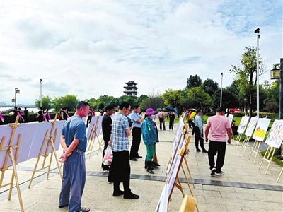 二乔公园举办的“小城巨变美嘉鱼”摄影展,吸引大量游客、市民前来观展。