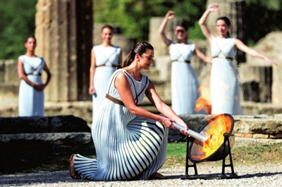 现场仪式的最高潮当属最高女祭司点燃火种的瞬间。当地时间中午12时08分,扮演最高女祭司的希腊知名女演员乔治乌向光明之神阿波罗祈祷,并利用凹面镜点燃了火种。