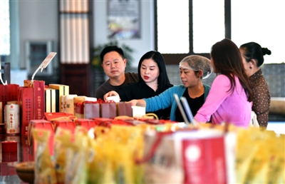10月17日,通山县大畈镇阳春园食品有限公司,游客在产品展台前选购麻饼。