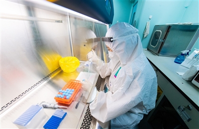 10月26日,工作人员在“猎鹰号”硬气膜实验室样本处理区作业。