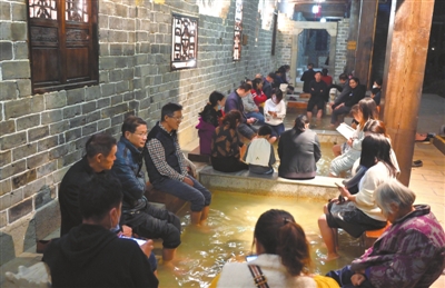 下午5时,潺潺温泉水从泡池里涌出,水温40℃左右,水及小腿肚,泡脚刚刚好。等候的市民脱了鞋袜,赤足入水,不一会儿,全身暖暖的。