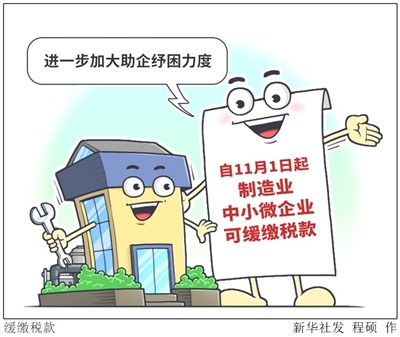 为进一步加大助企纾困力度,自11月1日起,制造业中小微企业可缓缴税款,至明年1月申报期结束。