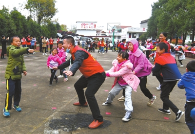 11月5日,咸安区大幕乡港背小学的留守儿童同爱心志愿者一起做游戏。