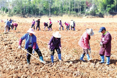 11月11日,咸安区向阳湖镇宝塔村金银花基地,村民们正忙着冬管。