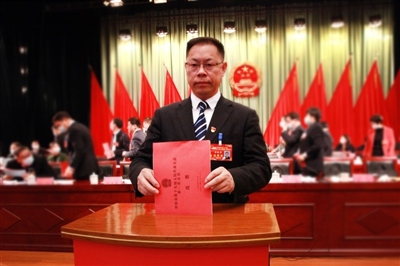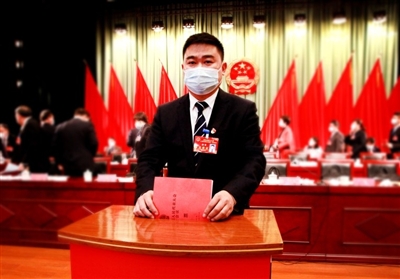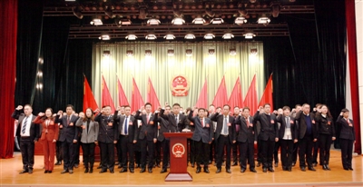 新当选人员集体向宪法宣誓,县委副书记、县长徐望(中)领誓。