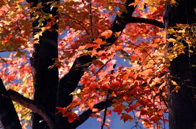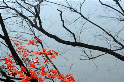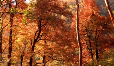 行至山顶,视野开阔,俯瞰大幕山,山色依层变换。绯红的枫树、金黄的桦叶、殷红的野果……点点簇簇地镶嵌在苍翠山峦之间,象打翻了颜料的油画,一抹暖阳洒下来,山色映照,美景迷人。