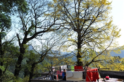 古树林中,一雄一雌两株银杏已有500年历史,胸径4米多。远远望去,树冠强壮饱满,枝干茂密繁盛,每一张叶片在阳光的照射下都闪着金光,风吹而过,树叶呼啦啦的像是金箔翻动,流光溢彩。