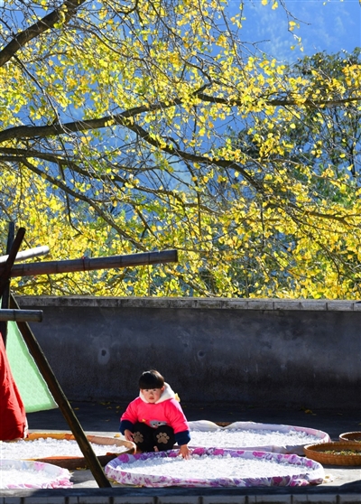 密林深处错落有致的古民居中,趁着秋日暖阳,村民们纷纷“晒秋”。有的搬出了自家的衣服被褥,有的将收获的辣椒、红苕粉等农作物,用竹制簸箕晾晒在门前空地、农家屋顶,一派秋意融融。