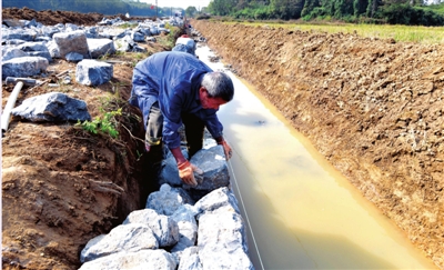 11月14日,嘉鱼县高铁岭镇新庄村,当地村民正在修建灌溉水渠。