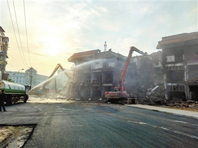 11月19日清晨,随着淦水商业城外围的几台拆危机械到位,危房拆除工作正式开始。拆除工作外围由区城管、区公安及交警部门拉起了警戒线,对来往围观市民进行劝诫。在拆危现场,几台“啄木鸟”散开作业,同时利用洒水车远程进行降尘,避免扬尘对周围环境造成影响。