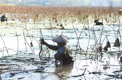 11月25日,嘉鱼县陆溪野生莲藕产业有限公司野藕基地,挖藕人正使用高压水枪冲挖出一根根莲藕。