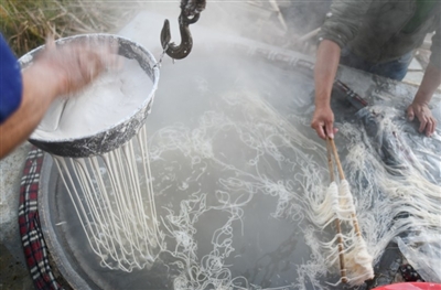 只见灶台下,三四名汉子撸起袖子,他们先将红薯淀粉调制成芡糊,然后和粉揣揉,粉团变得丝滑细腻后放入漏瓢中;灶台上,一位穿着蓝色大褂的人,左手端着漏瓢,右手握拳有节奏地捶击瓢中的粉团,淀粉从瓢底部的小洞里挤压出来变成白色的线条,线条又均匀地落入开水锅里。随后,一名妇女将开水锅里的粉条引出锅,放入装满冷水的木桶里冷却。后边的一位青年又赶紧用箩筐将冷却好的粉丝捞起,一路小跑着将它们晾晒到屋场外搭好的木架子上……