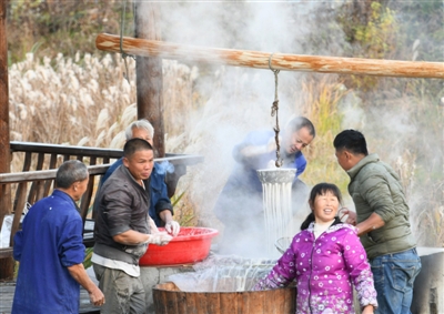 屋场前的田垄间,一口古泉无声流入池塘。塘畔是座木亭子,亭边有个土灶台。灶里火苗燃烧得正旺,十多位村民正围着灶台忙前跑后……11月30日傍晚,记者走进崇阳县白霓镇大塘村余家时,一幕热气腾腾的做“薯线粉”场景正在精彩上演。