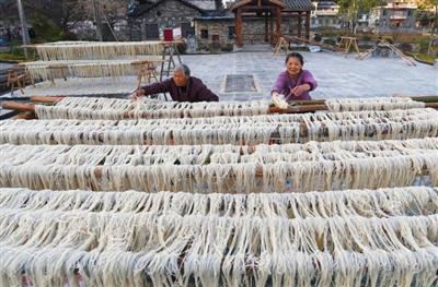 “用红薯淀粉手工制作粉条,是祖祖辈辈手口相传留下来的手艺。每年打霜结冰的季节,家家户户都要做,有的人家要做上千斤。”村民们告诉记者,这种技艺在当地方言叫薯线粉,已有上千年历史。