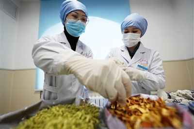 12月7日,哈尔滨市道里区中医医院工作人员在调配中药代茶饮。