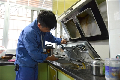 “首先对您家进行一下环境检测。”李伟祥拿起可燃气体检测仪,一边将吸气金属管伸到厨房上空,一边观察显示屏上是否有异常提醒,“检测仪采用的是泵吸式,将环境气体吸入检测设备,一旦检测到燃气浓度,就会显示数值,达到一定浓度会自动报警。”