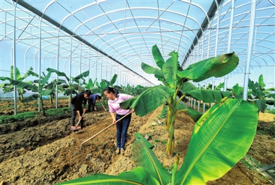 12月8日,崇阳县隽青家庭农场大棚糯蕉基地,农场总经理程艳和村民一起锄地,为套种蔬菜做准备。