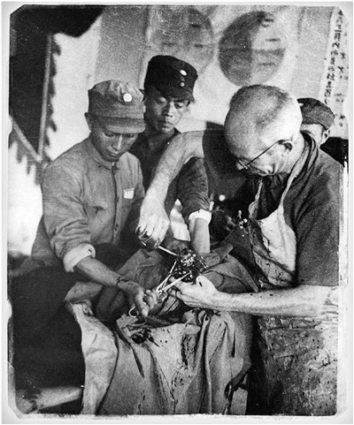 初到晋察冀根据地,白求恩就投入到战地救治和医院新建等工作中,每天除了开处方、做手术外,为了抓紧把松岩口村的龙王庙改建为“模范病室”,他亲自设计图纸,指挥泥工、木工改装房屋,指导木工、铁工、焊工制作各种医疗器械和设备。同时,制订医务制度,给医生、护士及护理员规定了个人职责;撰写战地医生护士培训教材,传授医疗技术;编写医疗图解手册,举办医务干部实习周。由于日军封锁严密,根据地医疗物资极其匮乏,白求恩因陋就简,亲自设计制作医疗器具,他用猪油配药膏替代凡士林,做成油纱布;用刮脸刀片代替手术刀,用竹签、废棉球代替探针,用竹片代替镊子,并自制石膏和绷带。凡此种种,沙飞先后拍摄下了《白求恩在模范病室为八路军伤员做手术》《白求恩为伤员检查身体》《白求恩和木工一起制作医疗器械》《白求恩编写师野战医院的组织与技术》,以及白求恩身着八路军军装,精神饱满、神采飞扬的《白求恩与晋察冀边区军政首长合影》《佩戴八路军臂章的白求恩大夫》《白求恩和八路军战士在一起》《白求恩和自卫队员》等感人照片。