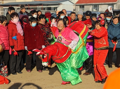 昨日,在山东省荣成市上庄镇的农村大集上,民间艺人们进行民俗表演。