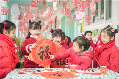 昨日,浙江省湖州市长兴县龙山街道中心幼儿园的孩子们在展示“福”字。