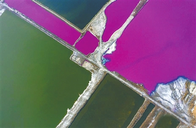 近日,山西省运城盐湖部分水域呈现玫瑰红,盐湖内生长着一种叫杜氏盐藻的嗜盐绿色微藻,随着天气变化在一定条件下会产生血红素,藻体呈红色,因而会把湖水染成红色,形成盐湖独特景色。