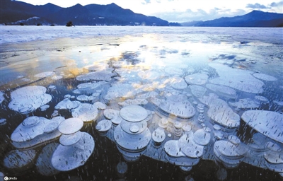 近日,日本北海道,当地糠平湖现“冰冻气泡”奇景。冰冻气泡由湖底植物释放的甲烷在靠近湖面过程中冻结形成。