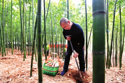 1月20日,崇阳县鑫丰雷竹种苗专业合作社基地,负责人刘梁汀正和工人们一起挖雷竹笋。