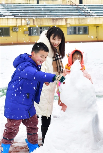 雪停间隙,人们在广场上堆雪人、打雪仗,孩子们你追我赶,尽情嬉戏,享受着瑞雪带来的欢乐。