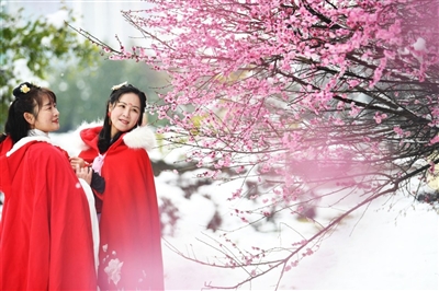一朵朵红梅迎雪怒放,丝毫不遮掩它的冷艳,吐出阵阵清香。梅花树下,一袭汉服美女,信手拈花,曼妙芳华。