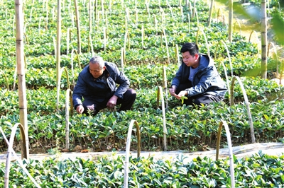 近日,在咸安区国营向阳苗圃场,59岁的场长梅仕华和区林业专家查看桂花苗长势。